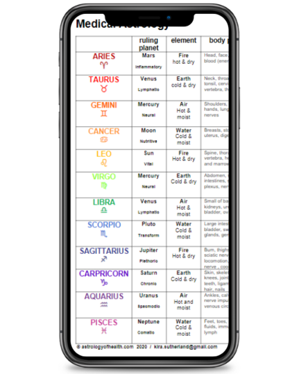 THIS CHART OFFERS A GREAT BEGINNER TABLE/ REVIEW OF THE BASICS OF SUN SIGNS IN MEDICAL ASTROLOGY
